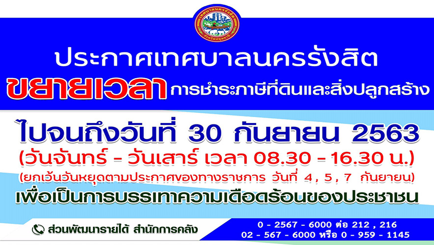 เพื่อเป็นการบรรเทาความเดือดร้อนของประชาชน เทศบาลนครรังสิตได้ ขยายเวลา การชำระภาษีที่ดินและสิ่งปลูกสร้าง ไปจนถึงวันพุธที่ 30 กันยายน 2563 ในวันจันทร์ ถึงวันเสาร์ ตั้งแต่เวล 08.30 น. ถึงเวลา 16.30 น.