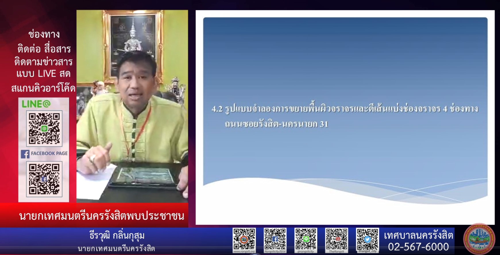 ขอเชิญรับชมรายการคุยกันเช้านี้ที่รังสิต ได้ที่ ลิงค์ https://youtu.be/FW_fY0rkpWg (เทปออกอากาศวันศุกร์ที่ 13 ก.ย.62) เทปนี้พบกับนายธีรวุฒิ กลิ่นกุสุม ท่านนายกเทศมนตรีนครรังสิต ที่มาประชาสัมพันธ์แนวทางการแก้ไขปัญหาจราจร การขยายถนนและตีเส้นแบ่งช่องจราจร บริเวณถนนซอยรังสิต-นครนายก 31และเชิญชวนบริจาคโลหิตให้กับสภากาชาดไทย/สกู๊ปโครงการสำรวจและออกแบบเพื่อพัฒนาโครงข่ายทางหลวง ตามแนวสายทาง ปทุมธานี-รังสิต-อ.องครักษ์/สกู๊ปกองทุนหลักประกันสุขภาพเทศบาลนครรังสิต/สกู๊ปโรงเรียนเรียนผู้สูงอายุเทศบาลนครรังสิต/ข่าวรับสมัครงาน/ข่าวประชาสัมพันธ์จากเทศบาลนครรังสิตในรอบสัปดาห์ โดยท่านสามารถรับชมย้อนหลังได้ที่ YouTube พิมพ์ : เทศบาลนครรังสิต ขอขอบคุณที่ติดตามรับชม หากท่านผู้ชมสนใจอยากให้ทางเทศบาล หยิบยกเรื่องราวหรือประเด็นต่างๆที่ท่านสนใจที่เกี่ยวกับภารกิจของเทศบาล ก็สามารถแจ้งเข้ามาได้ ทาง facebook : เทศบาลนครรังสิต หรือทาง Email:teerawoot04@gmail.com หรือทาง มือถือ 087-098-5559