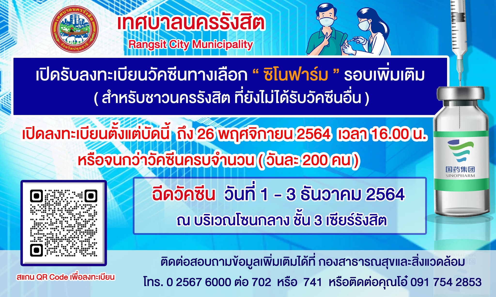 เทศบาลนครรังสิต แจ้งเปิดรับลงทะเบียนวัคซีนทางเลือก “ซิโนฟาร์ม” รอบเพิ่มเติม (สำหรับชาวนครรังสิต ที่ยังไม่เคยได้รับวัคซีนอื่น)