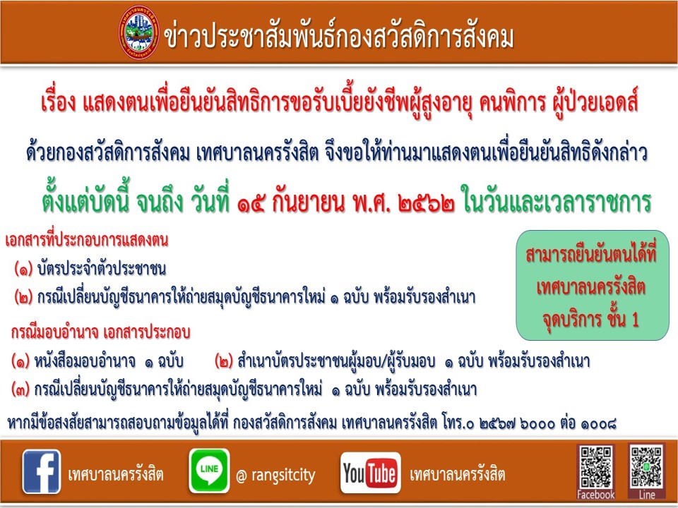 เทศบาลนครรังสิต จึงขอให้ท่านไปแสดงตนเพื่อยืนยันสิทธิการขอรับเงินเบี้ยยังชีพผู้สูงอายุ คนพิการ และผู้ป่วยเอดส์ ประจำปีงบประมาณ พ.ศ. 2563 ตั้งแต่บัดนี้ – 15 กันยายน 2562 เวลา 08.30 – 16.30 น. เว้นวันหยุดราชการ ณ สำนักงานเทศบาลนครรังสิต ชั้น 1