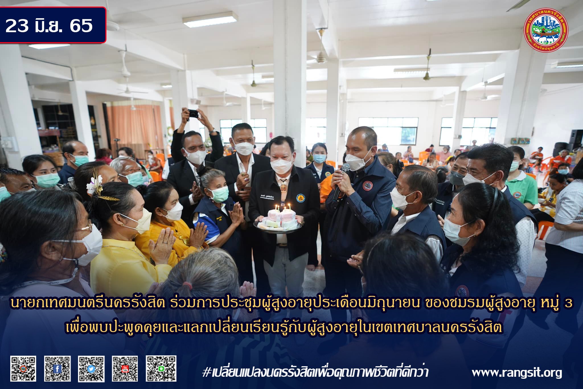 ร้อยตำรวจเอก ดร.ตรีลุพธ์ (นายกโบว์ลิ่ง) ธูปกระจ่าง นายกเทศมนตรีนครรังสิต ร่วมงานการประชุมผู้สูงอายุประเดือนมิถุนายน ของชมรมผู้สูงอายุ หมู่ 3 พร้อมมอบของขวัญวันเกิดให้แก่ผู้สูงอายุที่เกิดในเดือนมิถุนายน โดยภายงานจัดให้มีกิจกรรมให้ความรู้เรื่องการดูแลรักษาสุขภาพ และตรวจสุขภาพให้แก่ผู้สูงอายุ ณ อาคารเอนกประสงค์ วัดคลองหนึ่ง (แก้วนิมิตร) เมื่อวันที่ 23 มิ.ย. 2565