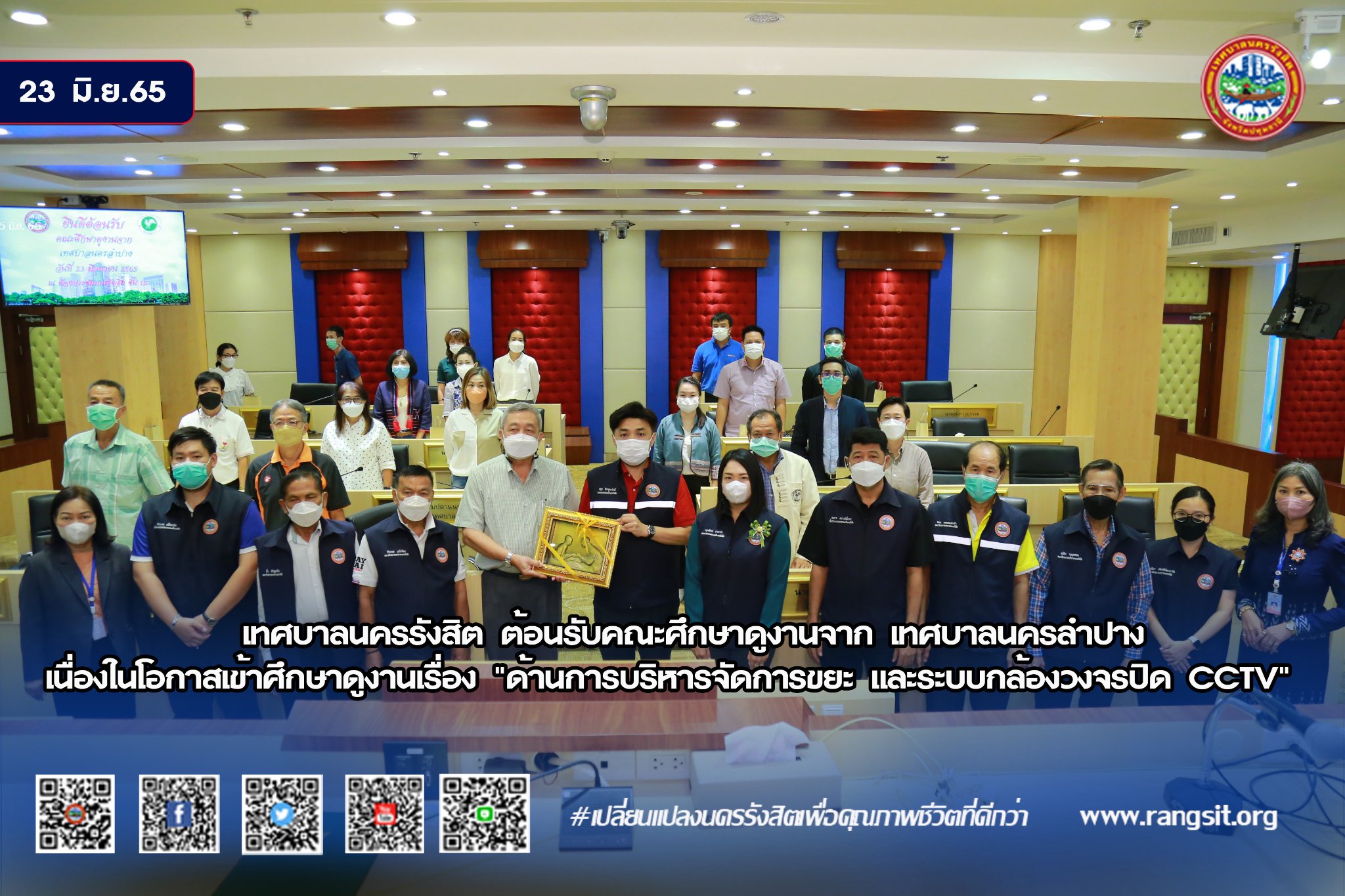 ร้อยตำรวจเอก ดร.ตรีลุพธ์ (นายกโบว์ลิ่ง) ธูปกระจ่าง นายกเทศมนตรีนครรังสิต มอบหมายให้นายชยุต สินพูนภักดิ์ รองนายกเทศมนตรีนครรังสิต ต้อนรับคณะศึกษาดูงานจาก เทศบาลนครลำปาง โดยมีนางสาวอรุณรัตน์ ปามาคำ รองนายกเทศมนตรี นายสมชาย สว่างวัชโรทร ที่ปรึกษานายกเทศมนตรีนครรังสิต สมาชิกสภาเทศบาล และหัวหน้าส่วนราชการเทศบาลนครรังสิต ร่วมให้การต้อนรับคณะศึกษาดูงาน เนื่องในโอกาสเข้าศึกษาดูงานเรื่อง "ด้านการบริหารจัดการขยะและระบบกล้องวงจรปิด CCTV" โดยคณะศึกษาดูงานฯ ได้เข้ารับฟังการบรรยายพร้อมเยี่ยมชมศูนย์ควบคุมและสั่งการเทศบาลนครรังสิต (ศูนย์RCC) เมื่อวันที่ 23 มิถุนายน 2565 ณ ห้องประชุมนครรังสิต สำนักงานเทศบาลนครรังสิต