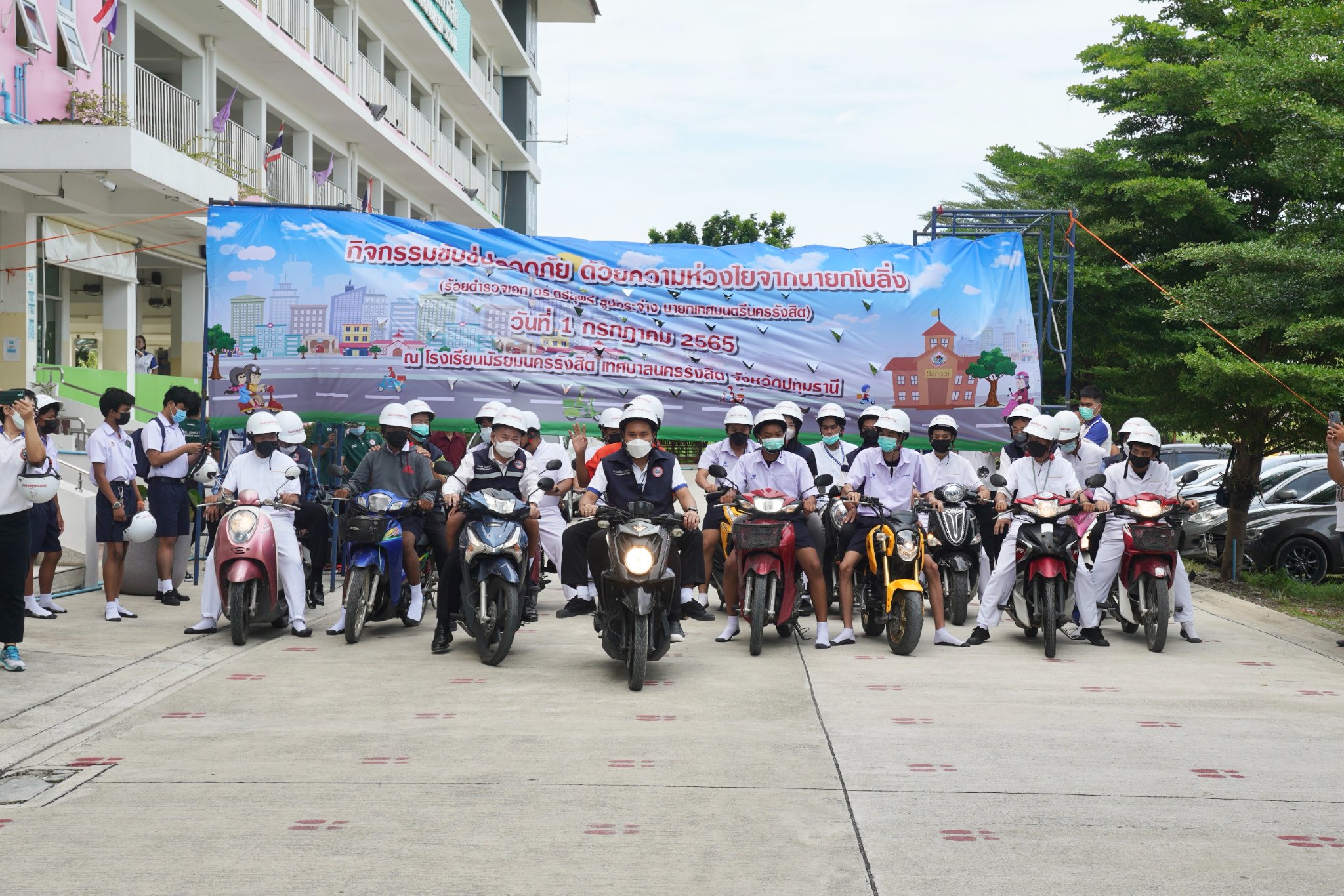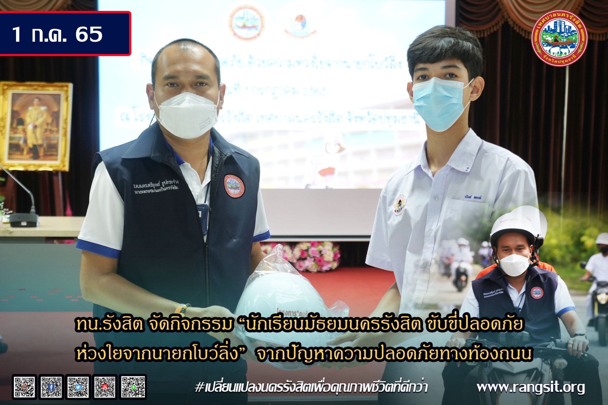 โดยมีเป้าหมาย เพื่อพัฒนานครรังสิต, และปทุมธานีของเรา ในทุกด้าน โดยเฉพาะภารกิจในการสร้างความปลอดภัยในชีวิตและทรัพย์สิน ผ่านการส่งมอบหมวกนิรภัยให้กับนักเรียน เพื่อแทนความห่วงใย ควบคู่ไปกับการ สร้างจิตสำนึก การขับขี่อย่างปลอดภัย เพื่อสร้างความปลอดภัยบนท้องถนน ณ โรงเรียนมัธยมนครรังสิต เมื่อวันที่ 1 ก.ค. 2565