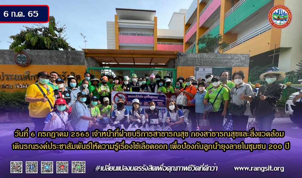 โดย กองสาธารณสุขและสิ่งแวดล้อมเทศบาลนครรังสิต ร่วมกับ อาสาสมัครสาธารณสุขประจำหมู่บ้าน (อสม.) ลงพื้นที่รณรงค์และป้องกันโรคไข้เลือดออก ออกเดินรณรงค์ประชาสัมพันธ์ให้ความรู้เกี่ยวกับโรคไข้เลือดออก เพื่อกำจัดลูกน้ำยุงลาย สำรวจและกำจัดภาชนะที่เป็นแหล่งเพาะพันธุ์ลูกน้ำยุงลาย ได้แจกแผ่นพับ และแจกทรายอะเบท เพื่อให้ชุมชนปลอดลูกน้ำยุงลาย ประชาชนปลอดภัยจากโรคไข้เลือดออก ณ บริเวณซอยหมู่บ้านรัตนโกสินทร์ 200
