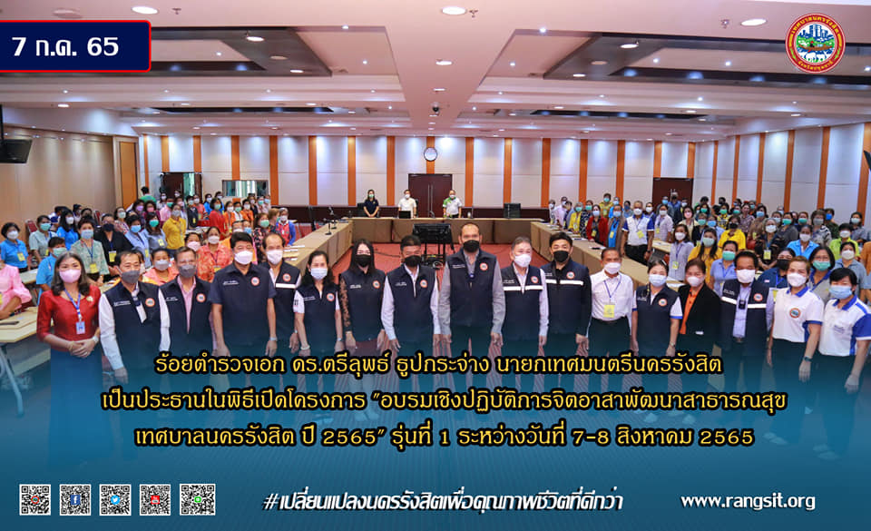 ร้อยตำรวจเอก ดร.ตรีลุพธ์ ธูปกระจ่าง นายกเทศมนตรีนครรังสิต เป็นประธานในพิธีเปิดโครงการ "อบรมเชิงปฏิบัติการจิตอาสาพัฒนาสาธารณสุข เทศบาลนครรังสิต ปี 2565" รุ่นที่ 1 ระหว่างวันที่ 7-8 สิงหาคม 2565 โดยมี นางสาวกฤษฎาพร นาคถนอม รองปลัดเทศบาลนครรังสิต เป็นผู้กล่าวรายงานวัตถุประสงค์ในการจัดโครงการฯ