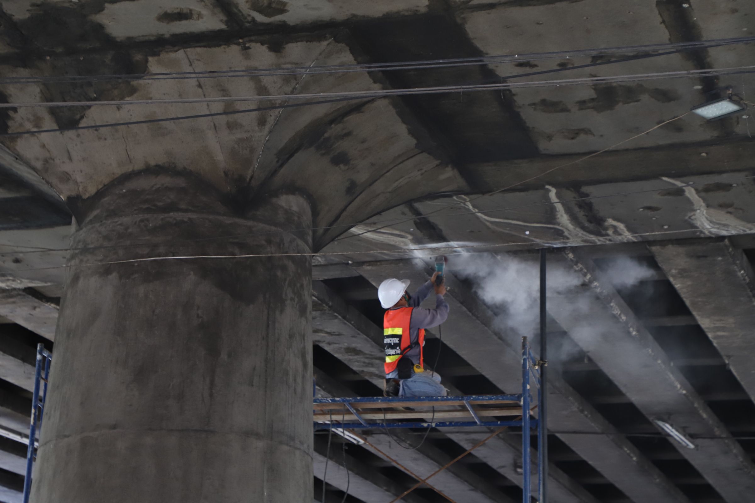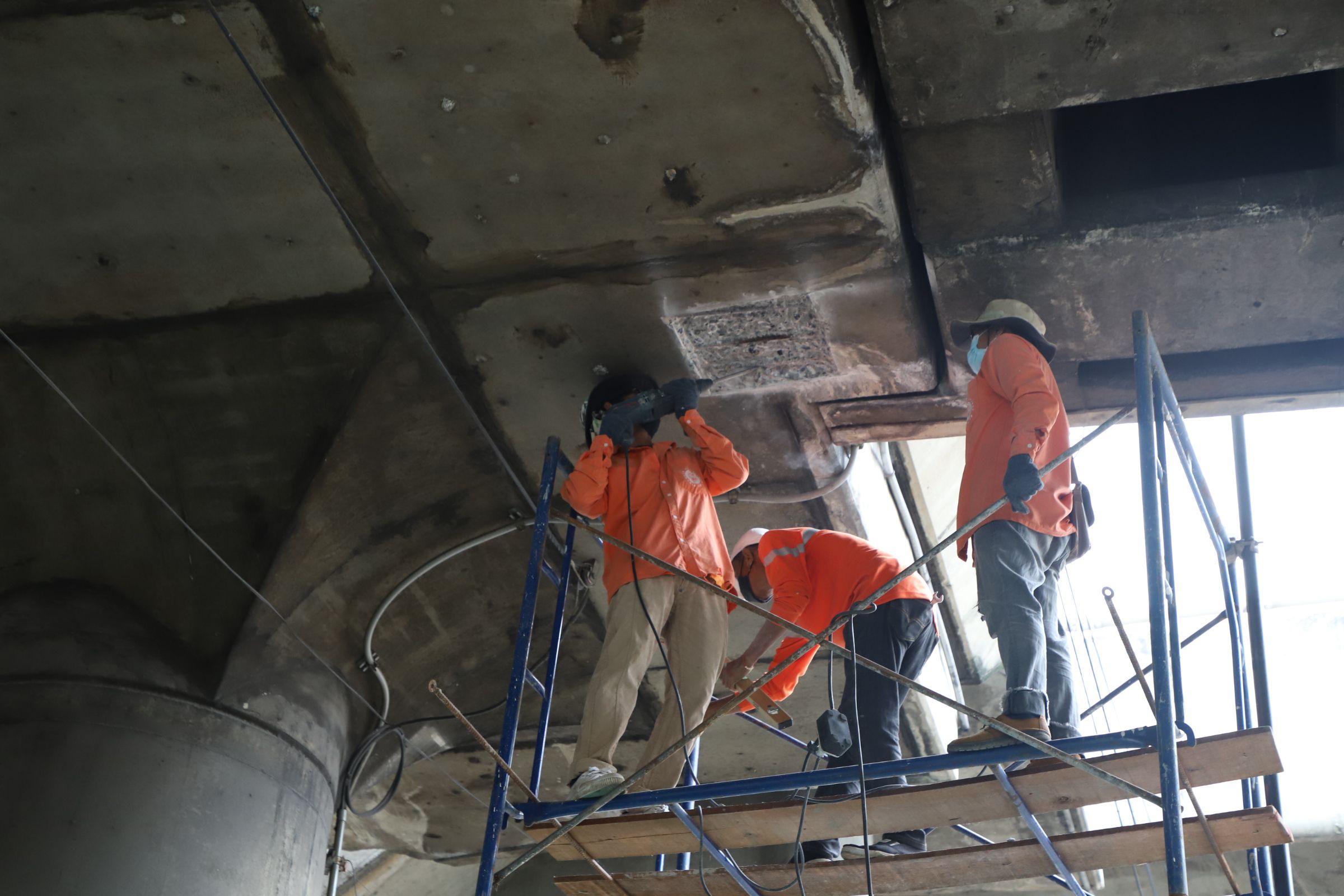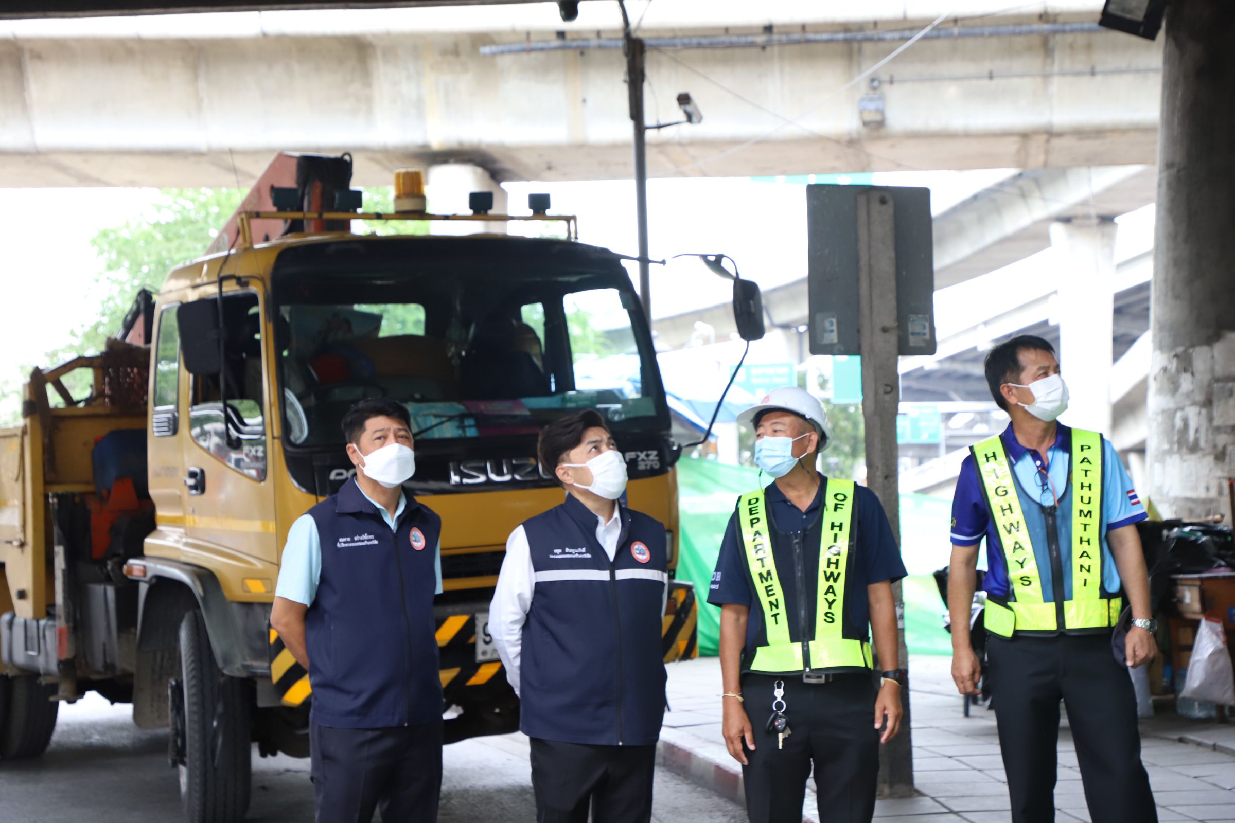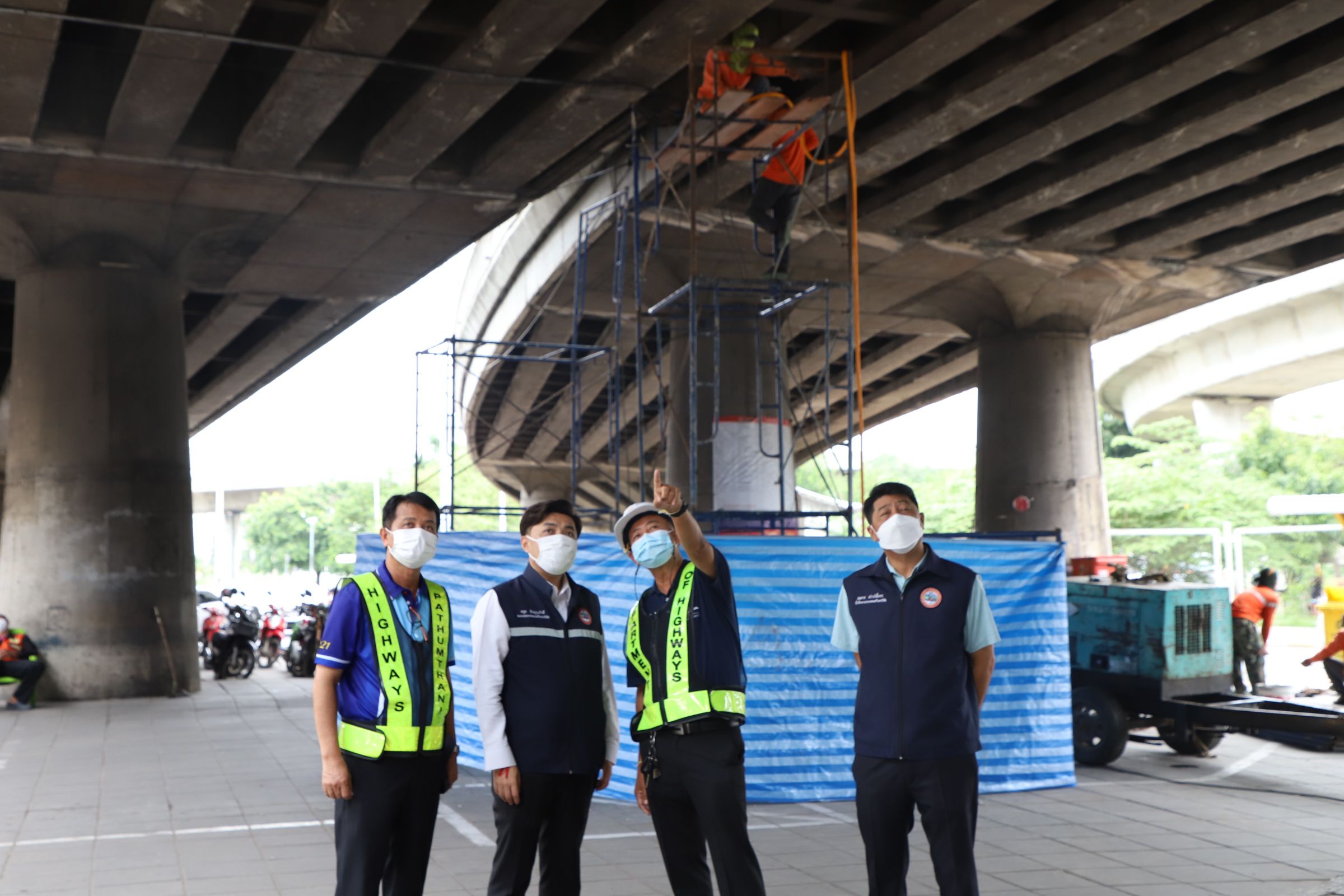 ลงพื้นที่ตรวจสอบการซ่อมแซมคานสะพานต่างระดับ ที่เศษปูนล่วงหล่นใต้สะพานต่างระดับหน้าตลาดรังสิต ดำเนินการซ่อมแซมโดย แขวงทางหลวงปทุมธานี กรมทางหลวง