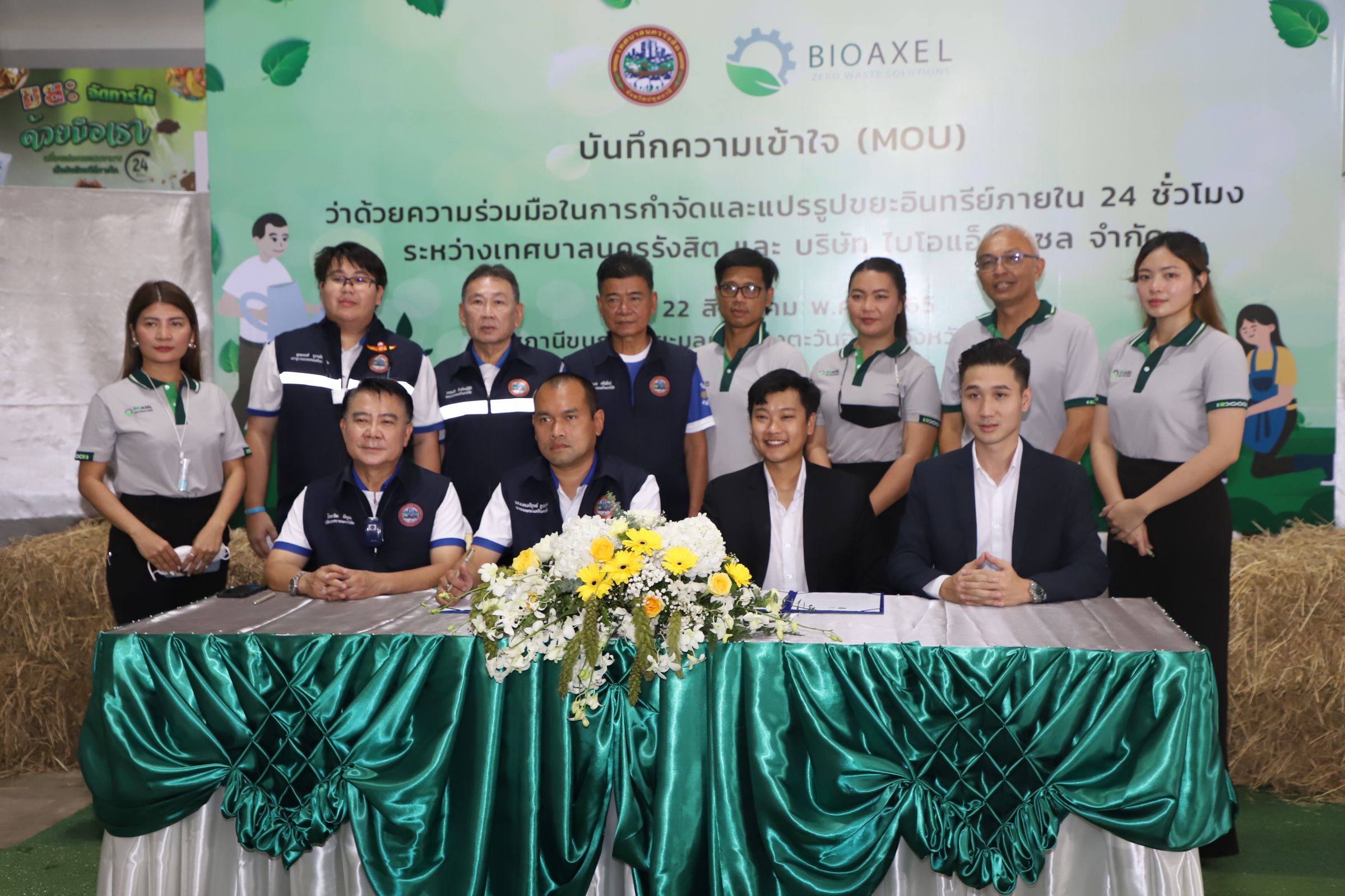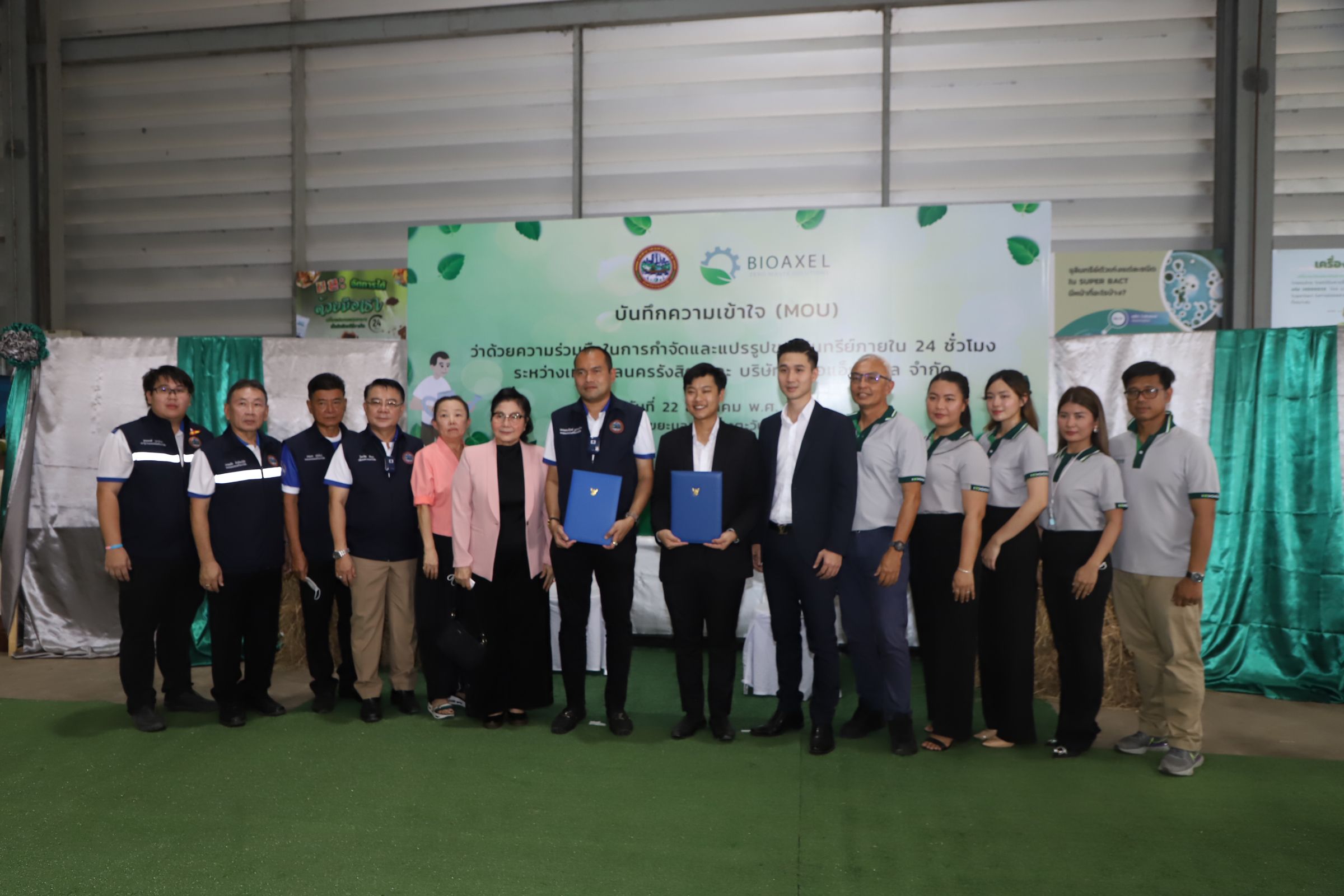 วันที่ 22 สิงหาคม 2565 ที่ สถานีขนถ่ายขยะมูลฝอยฝั่งตะวันออก เทศบาลนครรังสิต อำเภอคลองหลวง จังหวัดปทุมธานี พลตำรวจโท คำรณวิทย์ ธูปกระจ่าง นายกองค์การบริหารส่วนจังหวัดปทุมธานี เป็นประธานเปิดงาน "Grand Opening" สถานที่กำจัดเศษอาหารและวัชพืช(ผักตบชวา) โดยการแปรรูปเป็นปุ๋ยอินทรีย์ และพิธีลงนามบันทึกความเข้าใจ (MOU) ว่าด้วยความร่วมมือในการกำจัดและแปรรูปขยะอินทรีย์ภายใน 24 ชั่วโมง ระหว่างเทศบาลนครรังสิต และ บริษัท ไบโอแอ็กซ์เซล จำกัด โดยมี ร้อยตำรวจเอก ดร.ตรีลุพธ์ ธูปกระจ่าง นายกเทศมนตรีนครรังสิต กล่าวรายงาน ต่อมา พลตำรวจโท คำรณวิทย์ ธูปกระจ่าง นายกองค์การบริหารส่วนจังหวัดปทุมธานี พร้อมด้วยร้อยตำรวจเอก ดร.ตรีลุพธ์ ธูปกระจ่าง นายกเทศมนตรีนครรังสิต คณะผู้บริหารเทศบาลนครรังสิต คณะผู้บริหารของบริษัท ไบโอแอ็กซ์เซล จำกัด และแขกผู้มีเกียรติ ร่วมเปิดป้ายสถานที่กำจัดขยะเศษอาหารและวัชพืช (ผักตบชวา) โดยการแปรรูปเป็นปุ๋ยอินทรีย์ จากนั้น ร้อยตำรวจเอก ดร.ตรีลุพธ์ ธูปกระจ่าง นายกเทศมนตรีนครรังสิต พร้อมด้วย นายไชยวัฒ มีคุณ ปลัดเทศบาลนครรังสิต และคณะผู้บริหารของบริษัท ไบโอแอ็กซ์เซล จำกัด ลงนามในบันทึกความเข้าใจ (MOU) ว่าด้วยความร่วมมือในการกำจัดและแปรรูปขยะอินทรีย์ภายใน 24 ชั่วโมง ระหว่างเทศบาลนครรังสิต และ บริษัท ไบโอแอ็กซ์เซล จำกัด ทั้งนี้ นายสมศักดิ์ เกียรติพัฒนาชัย ประธานที่ปรึกษานายกเทศมนตรีนครรังสิต พร้อมด้วย นายธนเดช ศรีเพ็ชร์ นายชยุต สินพูนภักดิ์ นายวรรณชัย อิทธิมณีสิริ รองนายกเทศมนตรีนครรังสิต นายสมชาย สว่างวัชโรทร ที่ปรึกษานายกเทศมนตรีนครรังสิต นายสุทธพงศ์ บุราพันธ์ เลขานุการนายกเทศมนตรีนครรังสิต สมาชิกสภาเทศบาลนครรังสิต ที่ปรึกษากิตติมศักดิ์นายกเทศมนตรีนครรังสิต ปลัดเทศบาล รองปลัดเทศบาล หัวหน้าส่วนราชการ บุคลากรเทศบาลนครรังสิต และผู้แทนชุมชน เข้าร่วมเป็นเกียรติในงานครั้งนี้ วัตถุประสงค์ในบันทึกความเข้าใจ (MOU) ว่าด้วยความร่วมมือในการกำจัดและแปรรูปขยะอินทรีย์ภายใน 24 ชั่วโมง ระหว่างเทศบาลนครรังสิต และ บริษัท ไบโอแอ็กซ์เซล จำกัด เพื่อส่งเสริมการแยกขยะที่ถูกต้องตั้งแต่ต้นทาง เป็นการกำจัดที่ถูกต้องตามหลักวิชาการ และยังเป็นการแปรรูปขยะไร้ค่าให้เกิดประโยชน์แก่ประชาชนในพื้นที่ได้อย่างแท้จริง ซึ่งยังถือเป็นเพียงจุดเริ่มต้นของการนำเทคโนโลยี และเครื่องจักรสมัยใหม่ เข้ามาช่วยในการดำเนินการแก้ปัญหาการจัดการขยะอินทรีย์ได้อย่างรวดเร็ว และมีประสิทธิภาพ ซึ่งจะสามารถต่อยอดและขยายวงกว้าง เป็นแนวทางการกำจ