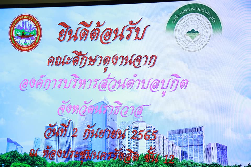 ให้การต้อนรับคณะศึกษาดูงานจาก องค์การบริหารส่วนตำบลบูกิต อำเภอเจาะไอร้อง จังหวัดนราธิวาส วันที่ 2 กันยายน 2565 เวลา 09.00 น. ณ ห้องประชุมนครรังสิต ชั้น 12 สำนักงานเทศบาลนครรังสิต ร้อยตำรวจเอก ดร.ตรีลุพธ์ ธูปกระจ่าง นายกเทศมนตรีนครรังสิต มอบหมายให้ นายธนเดช ศรีเพ็ชร์ รองนายกเทศมนตรี เป็นประธานกล่าวต้อนรับ คณะศึกษาดูงานจาก องค์การบริหารส่วนตำบลบูกิต อำเภอเจาะไอร้อง จังหวัดนราธิวาส โดยมี นายสมศักดิ์ เกียรติพัฒนาชัย ประธานที่ปรึกษานายกเทศมนตรี นายสมชาย สว่างวัชรโรทร ที่ปรึกษานายกเทศมนตรี นางสาวนันธิดา เกียรติพัฒนาชัย นายปรีชา เรียนหัตถกรรม สมาชิกสภาเทศบาลนครรังสิต และหัวหน้าส่วนราชการเทศบาลนครรังสิต ร่วมให้การต้อนรับคณะฯ นำโดย นายสะมะแอ สะตาปอ นายกองค์การบริหารส่วนตำบลบูกิต พร้อมคณะ จำนวน 46 คน เข้าศึกษาดูงานเพื่อพัฒนาศักยภาพและเพิ่มประสิทธิภาพในการบริหารจัดการตามหลักธรรมาภิบาล พร้อมรับฟังการบรรยาย เรื่อง "การบริหารจัดการขยะในชุมชน" โดยมี นางสาวประมวญ อุทรักษ์ หัวหน้าฝ่ายรักษาความสะอาด กองสาธารณสุขและสิ่งแวดล้อม เทศบาลนครรังสิต เป็นวิทยากรบรรยาย #เปลี่ยนแปลงนครรังสิตเพื่อคุณภาพชีวิตที่ดีกว่า #มุ่งมั่นทุ่มเทพัฒนาเพื่อนครรังสิตบ้านเรา #เทศบาลนครรังสิต
