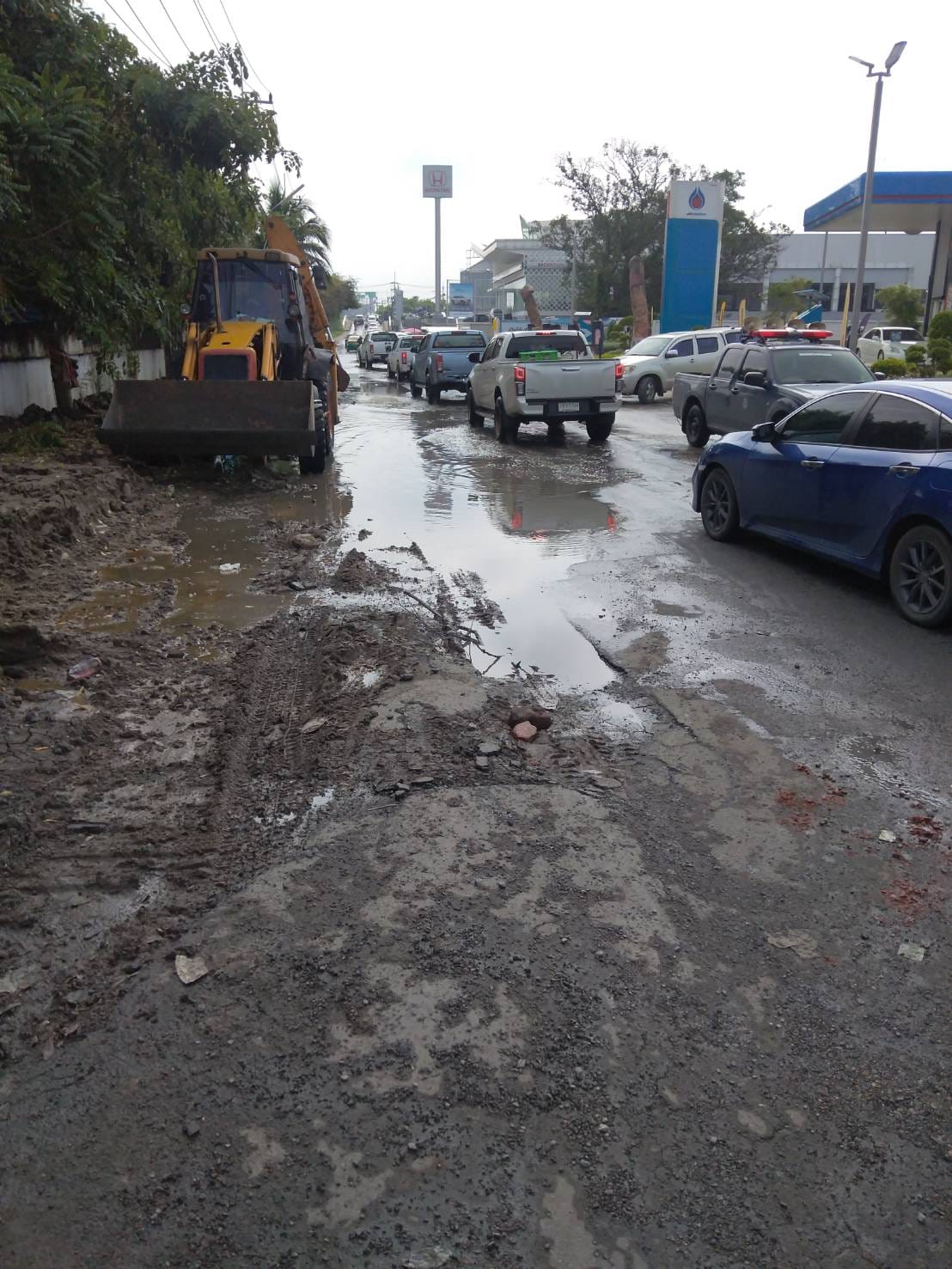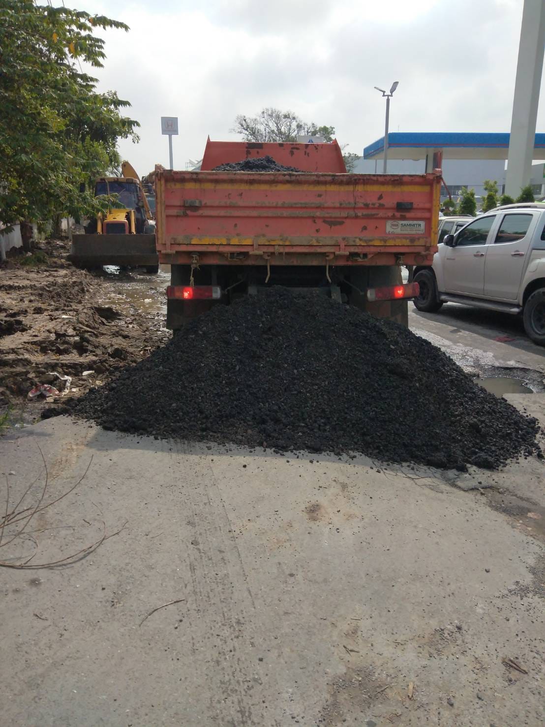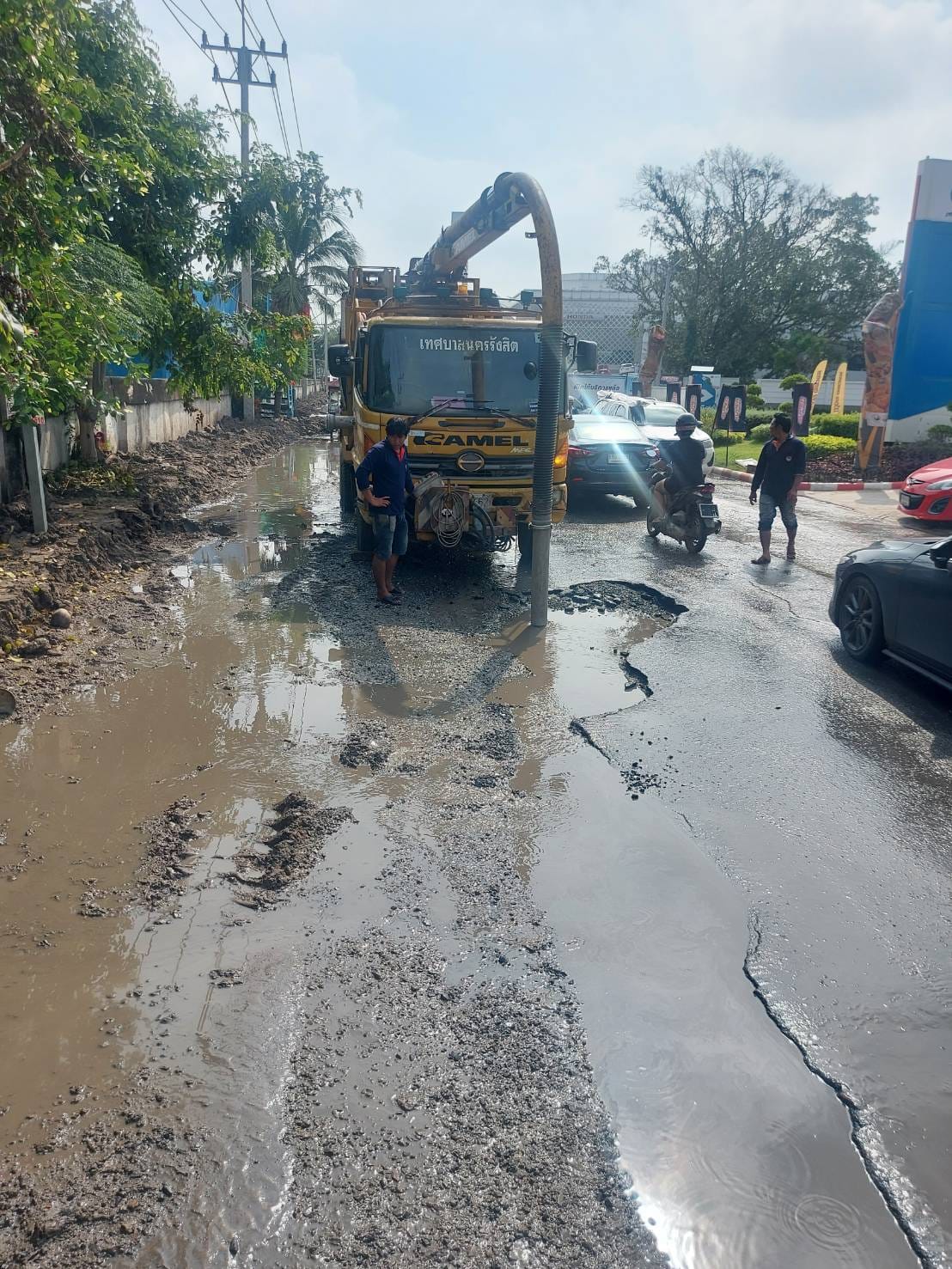 ดำเนินการนำรถดูดน้ำออก พร้อมนำหินคลุกซ่อมถนนที่เป็นหลุมบ่อ