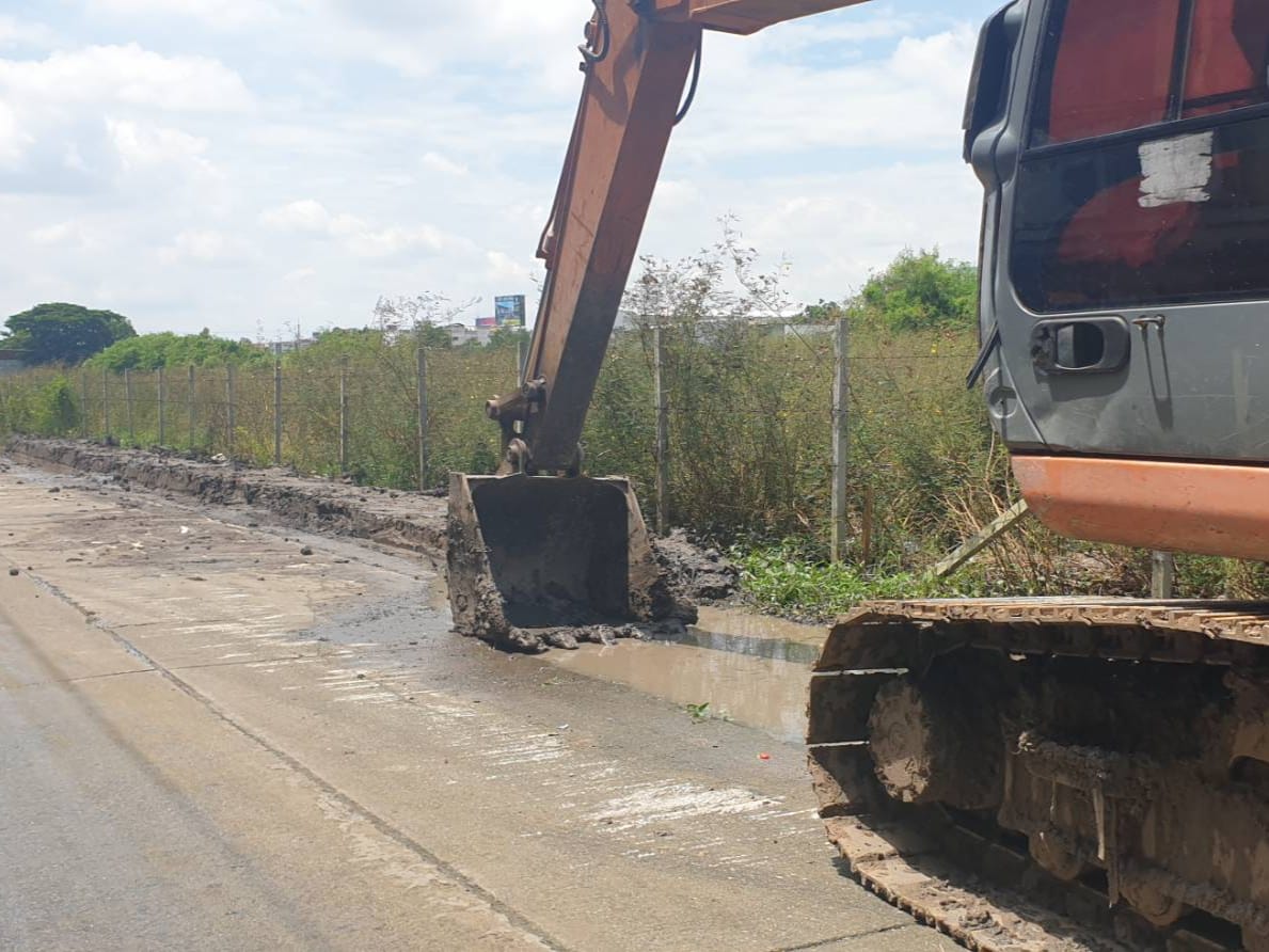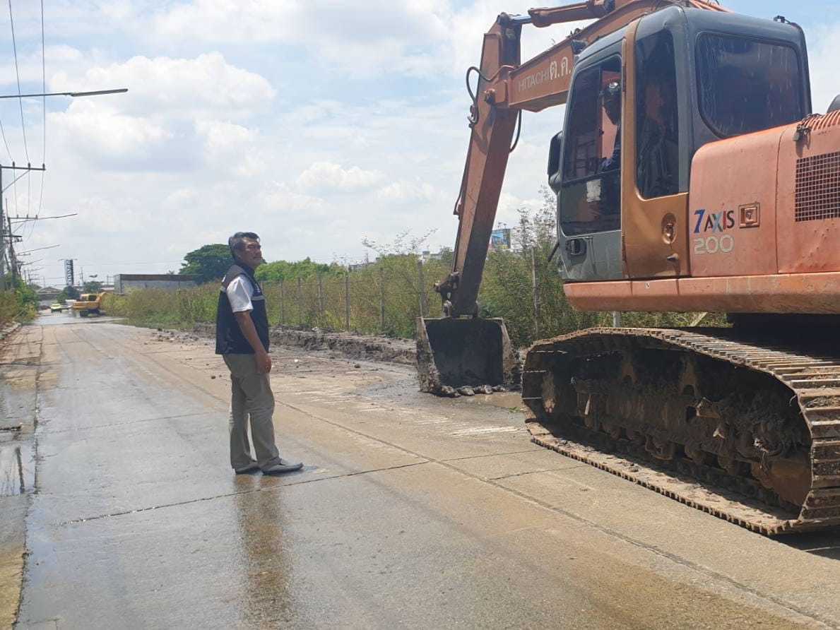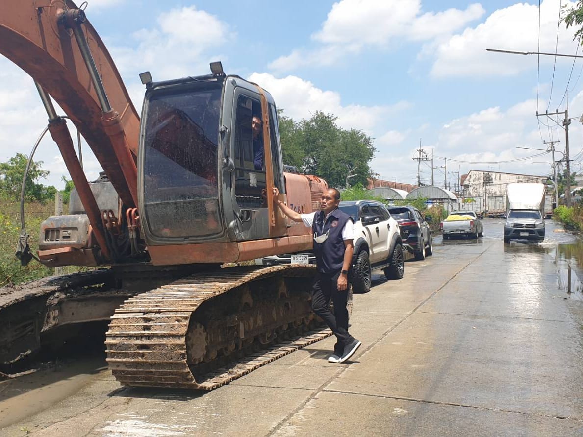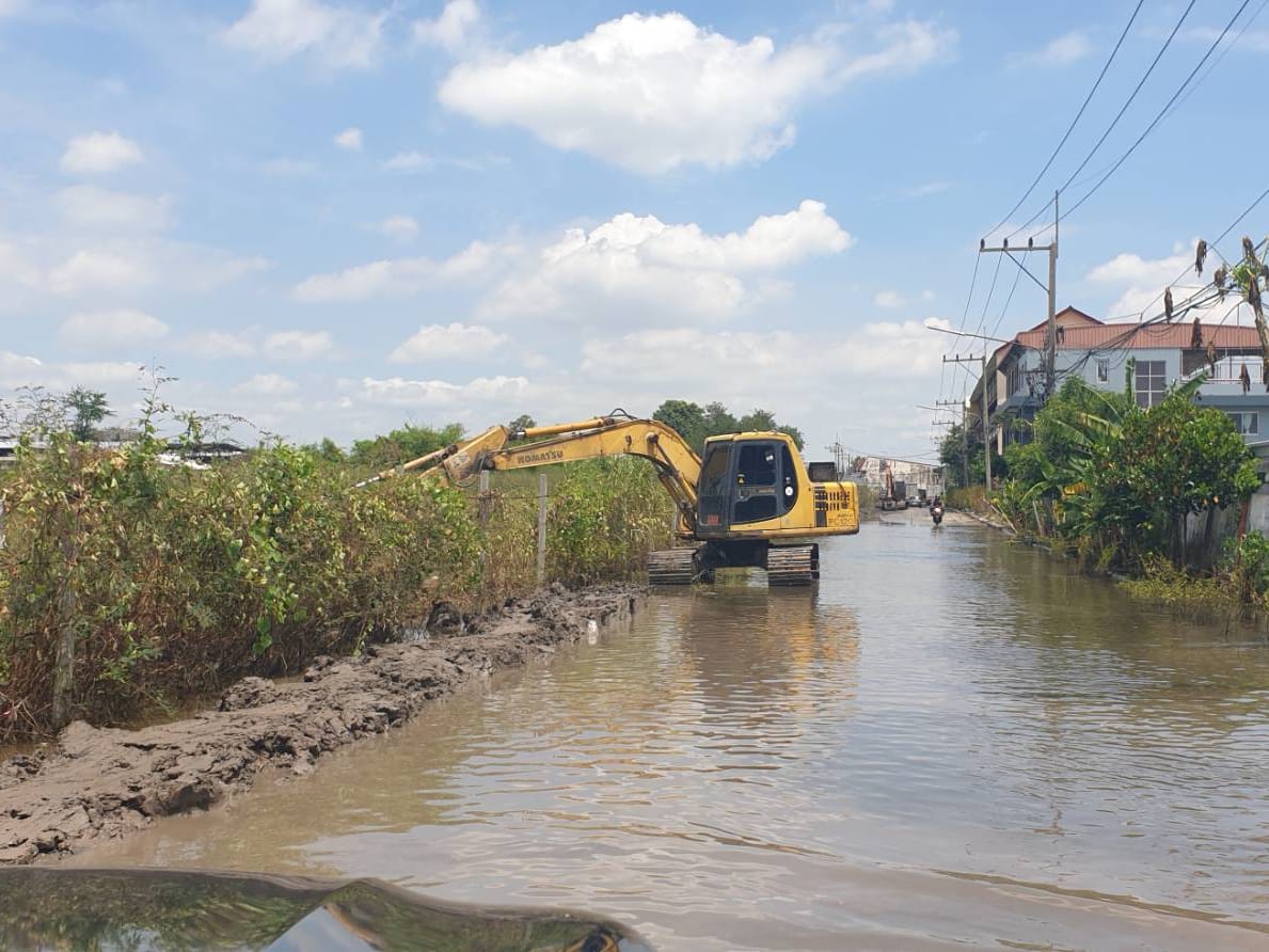 ลงพื้นที่ควบคุมการดำเนินการทำคันดินกั้นน้ำบริเวณถนนทางเข้า-ออก ชุมชนหมู่บ้านเสนาวิลล่า 91