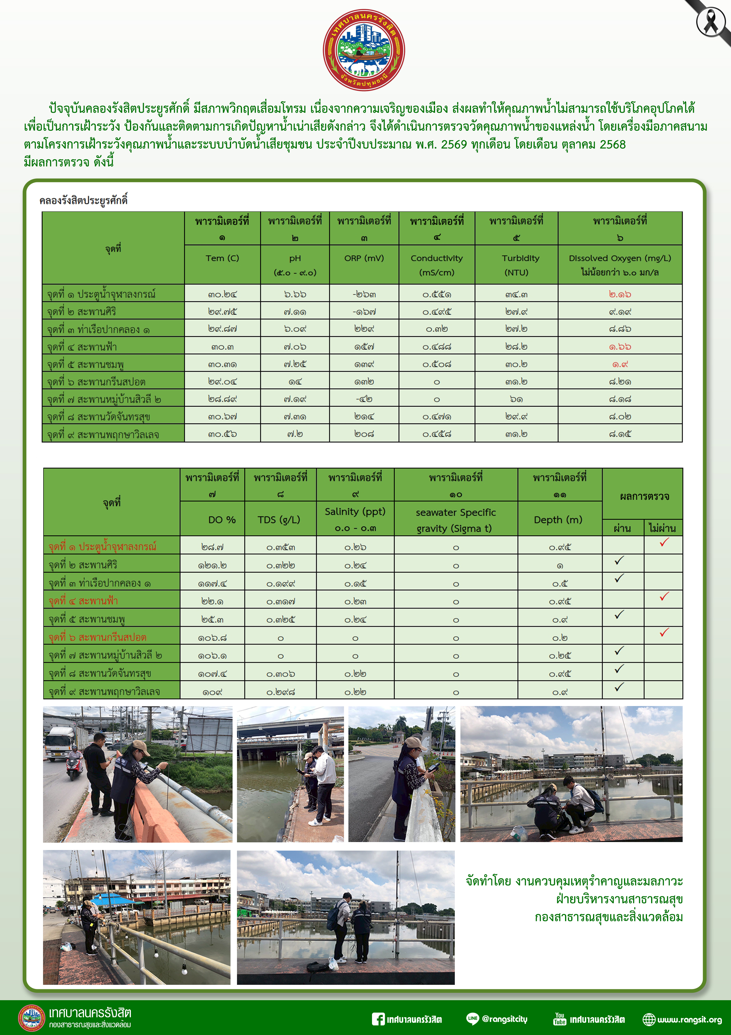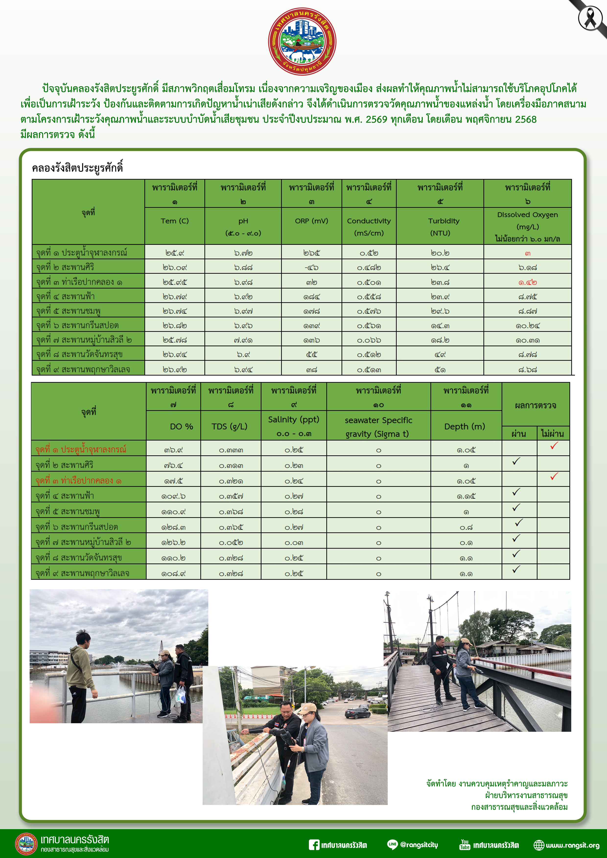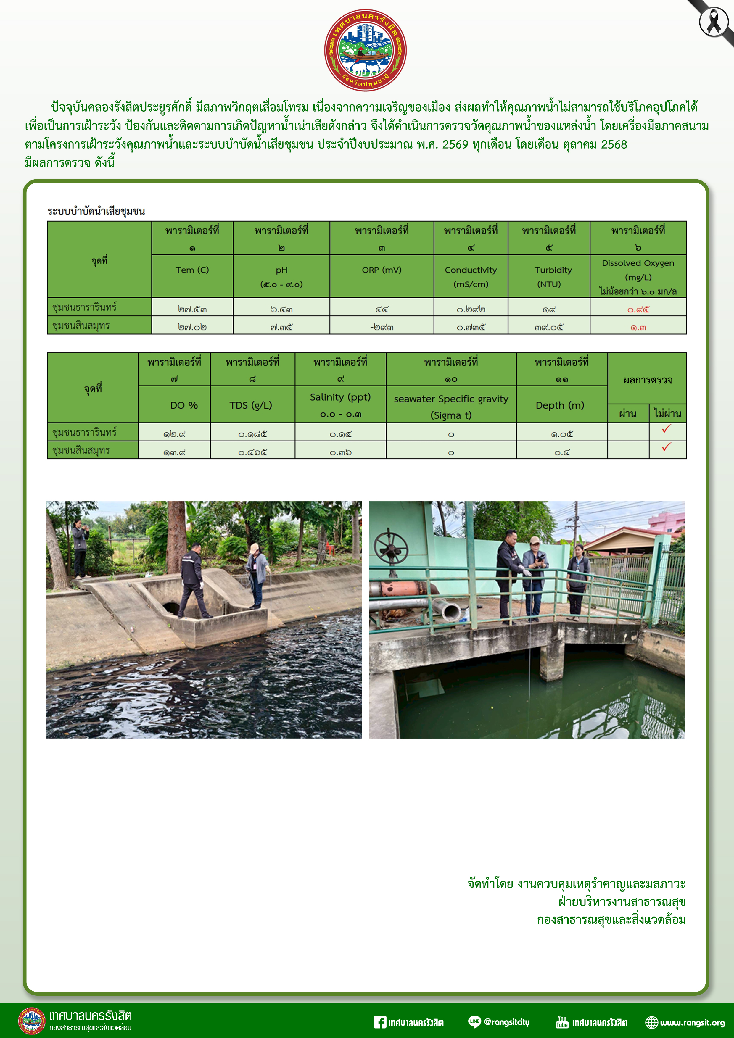 | ดูและดาวน์โหลด | รายงานผลการตรวจวัดคุณภาพน้ำในคลองรังสิตประยูรศักดิ์และผลตรวจน้ำบ่อบำบัดน้ำเสีย ปีงบประมาณ 2569 | เดือน ตุลาคม |